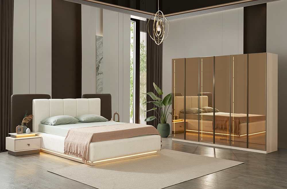 Takım İçeriği | Karyola-başlık, gardırop, şifonyer, iki adet komodin |